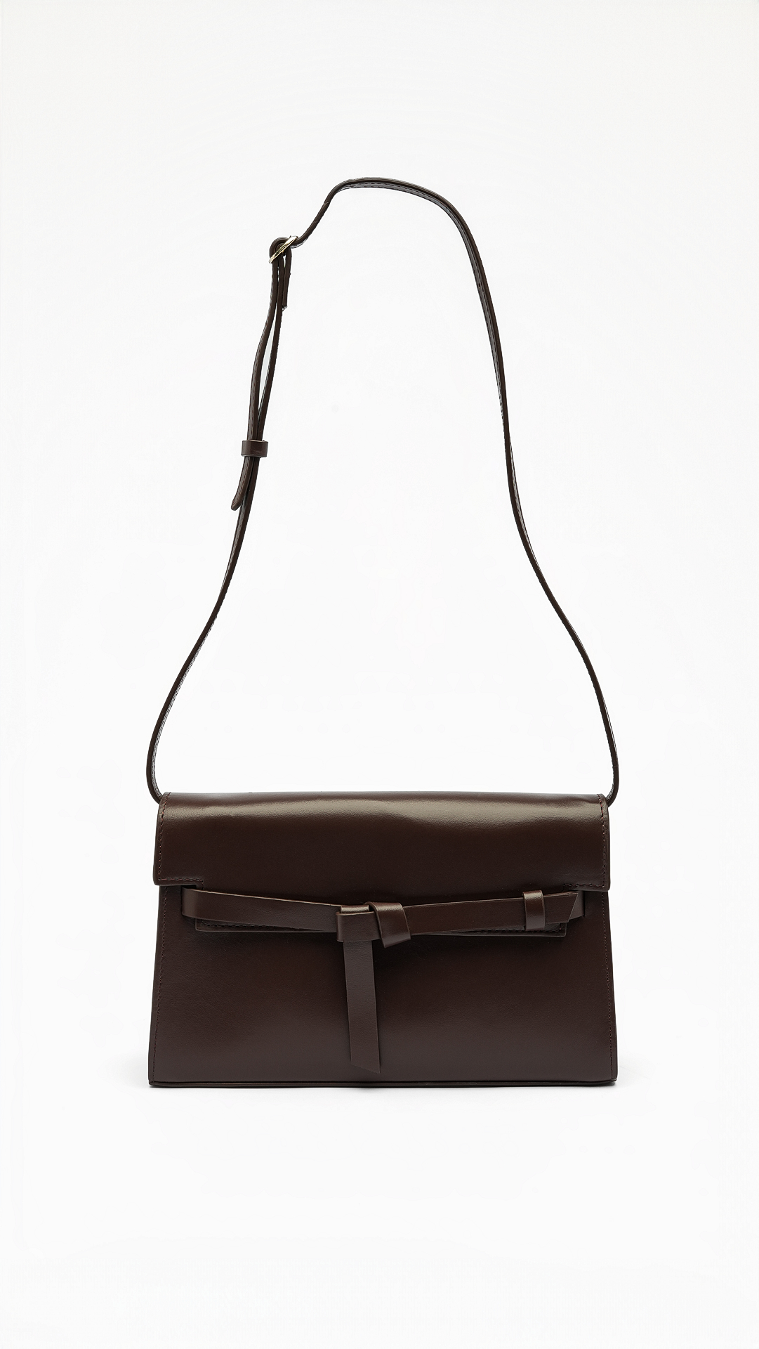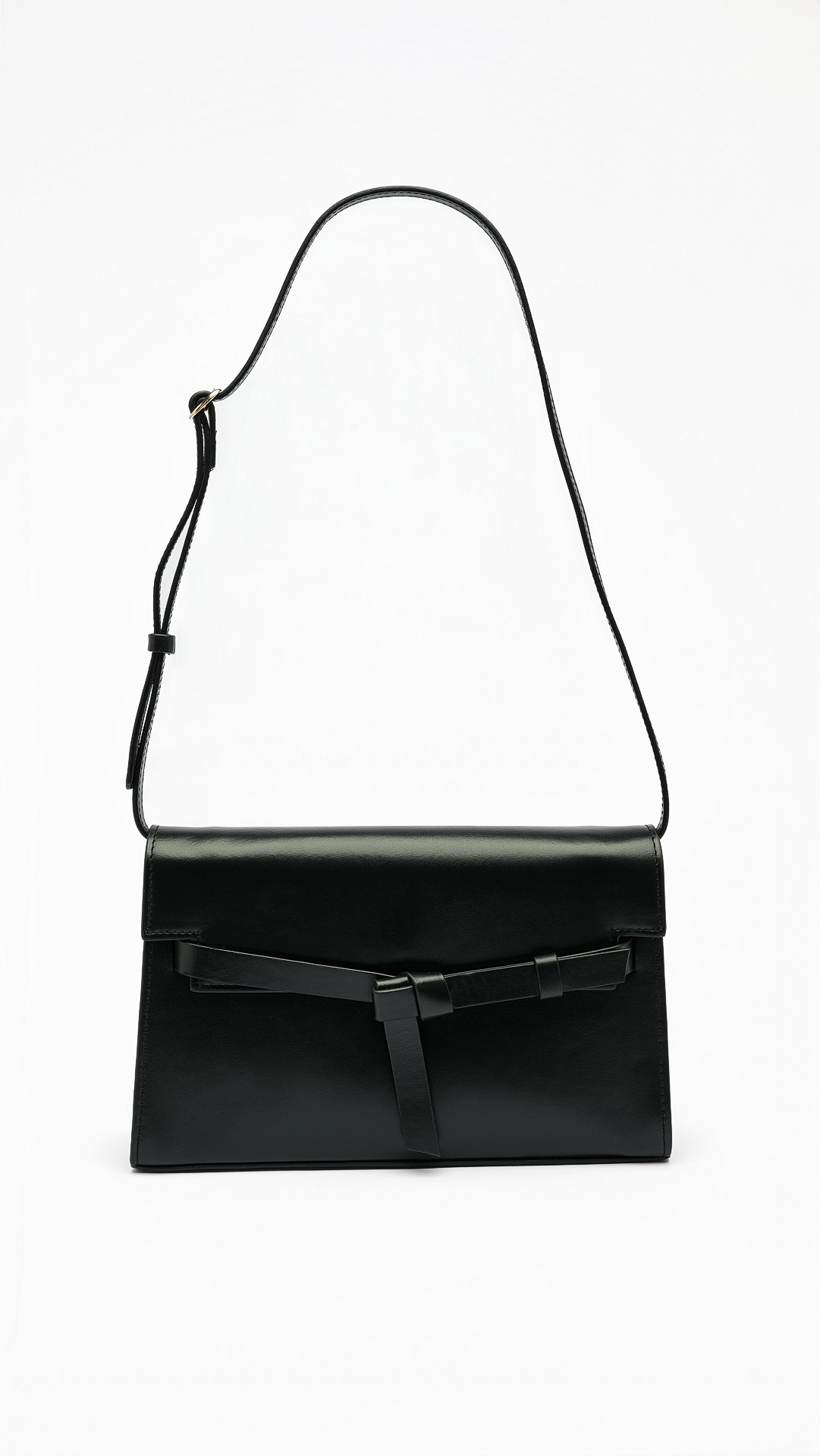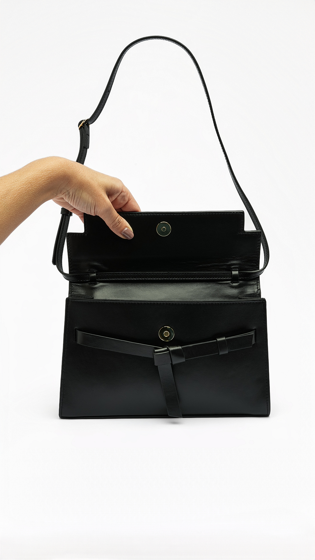 La solapa se adorna con un lazo sutil que aporta un gesto elegante,
